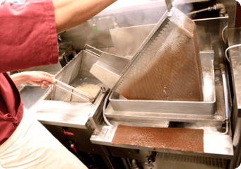 平成25年のリニューアルオープン後、「さらにおいしくなった」と評判を呼んでいる。そのきっかけとなったのが、調理機器の大幅な入れ替えである。自ら厨房に入り、限られたスペースでスピード提供する苦労を知っていた専務取締役の池田克禎氏は、駅の耐震補強工事の影響で休業を余儀なくされた半年間の間に、厨房内の効率化を計画。以前から小林熱機工業株式会社の電磁てんぷら台を愛用していたこともあり、同社へと相談し、新たにハイブリッド茹で麺機、蓄氷シンク、麺つゆ製造保温釜を導入した。